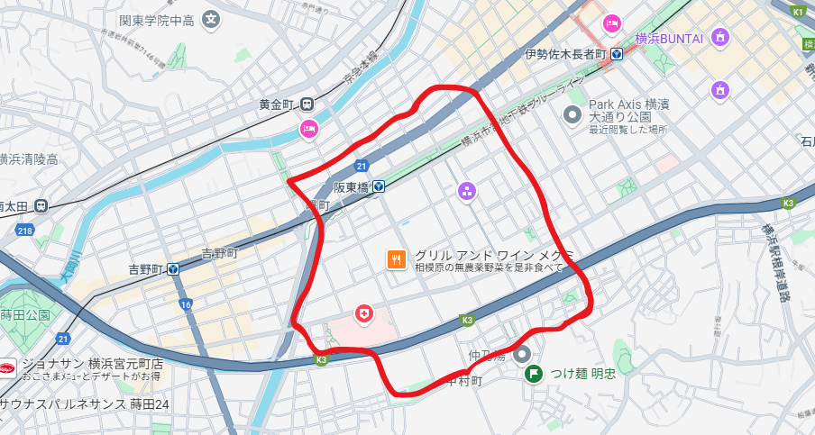 もちろん行先次第で変わるとは思うんですけど、人から最寄り駅を問われた際に「阪東橋です」って告げるのはこのくらいなのでは…と予想します。もちろん管理人もこの赤枠内に住んでいます。